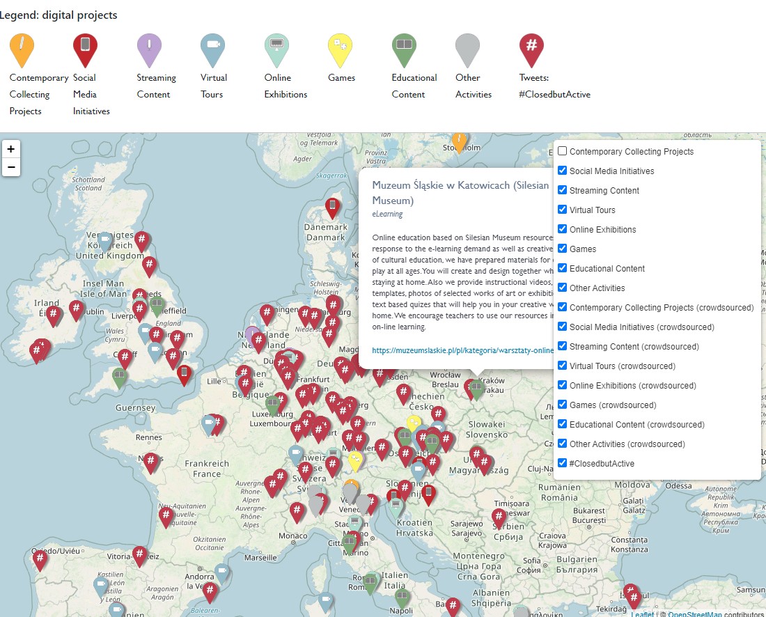 Během svého uzavření nebo omezení provozu z důvodu preventivních opatření se řada evropských i světových muzeí obrátila k digitálním a virtuálním projektům jako prostředku komunikace s návštěvníky a zájemci. Centrum informačního modelování Univerzity ve Štýrském Hradci proto uvedlo do provozu interaktivní mapu těchto aktivit evropských muzeích a galeriích. Mapa rozlišuje hned několik typů muzejních aktivit, jako je streamovaný obsah, vytváření sbírky s tématem koronavirové pandemie, vzdělávací projekty nebo virtuální prohlídky. Mapa je průběžně aktualizována, instituce samotné mohou svůj projekt kdykoliv přidat a informovat o něm i uživatele z jiných zemí.