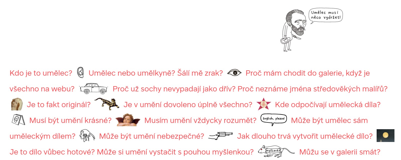 Projekt je doprovázen bohatým obrazovým materiálem a poutavými ilustracemi výtvarníka Kakalíka. Nabízí příběhy jednotlivých umělců a uměleckých děl, které formovaly podobu umění především v posledním století. Interaktivní forma webu předává informace zábavnou formou, na níž je kromě nejčastěji pokládaných otázek i možnost vytvořit si vlastní dílo, vyhledat si jednotlivá díla na časové ose či mapě galerií.