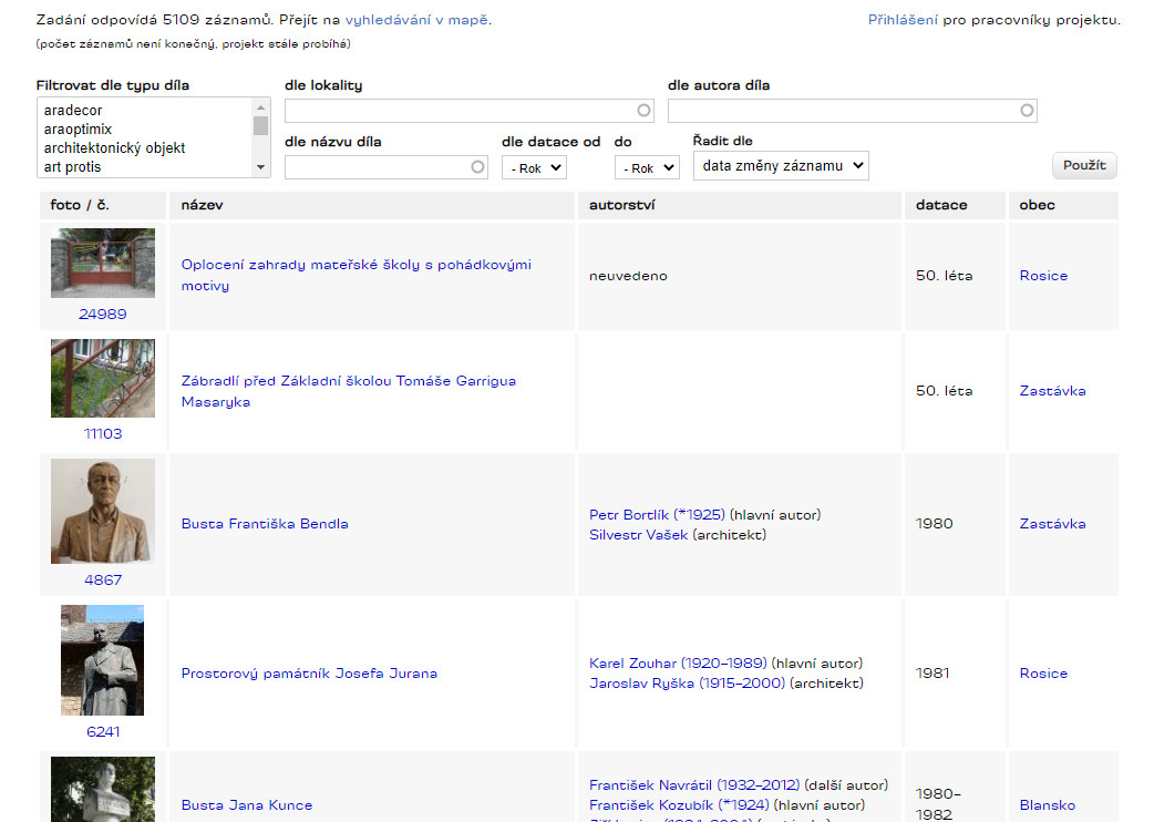 Jedním z výstupů projektu je i veřejně přístupná databáze sledovaných exteriérových sochařských díl, které patří mezi nejohroženější skupiny nemovitého kulturního dědictví. Databáze prezentuje sochy, pomníky, reliéfy, mozaiky, sgrafita či nástěnné malby, které vznikaly od 50. let do konce 80. let 20. století. Zahrnuje ale také grafické práce, například neony, piktogramy či informační systémy pro budovy.